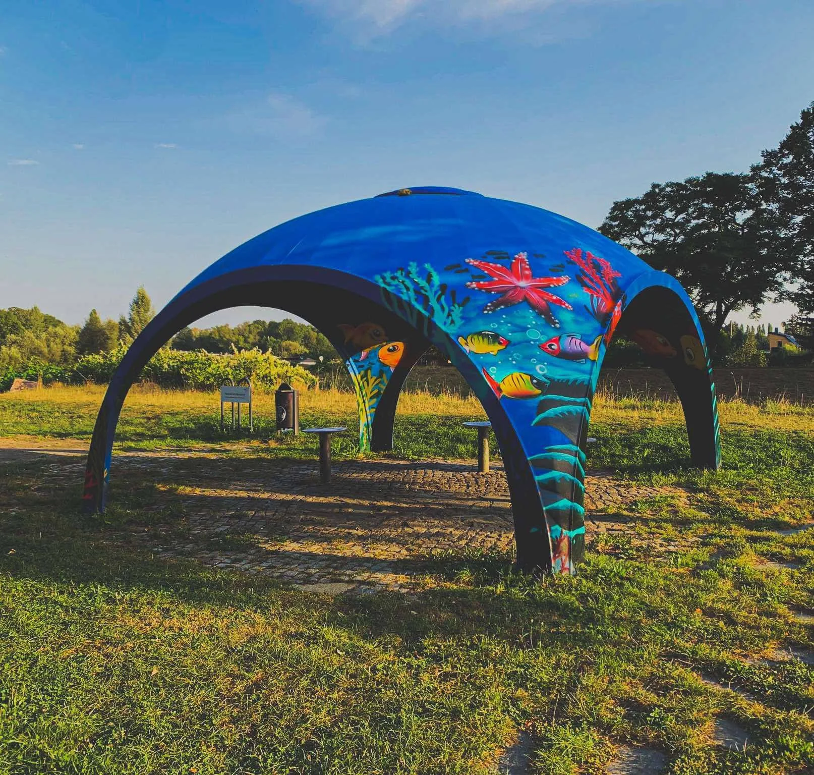 Im August 2024 verschönerte ich gemeinsam mit einem Künstlerkollegen den Pavillon in Pölbitz, Zwickau. Der ehemalige Grillplatz erfreut sich nun an einer verträumten Unterwasserwelt.